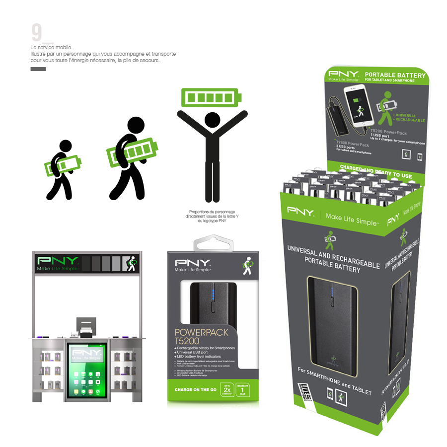 Les chargeurs de secours, bien que très pratiques restent peu vendus, notamment en France en GMS, car les consommateurs ne comprennent pas le produit en rayon. La mission confiée à l’agence était donc la conception d’un pictogramme devant expliciter la fonction de ces «boîtiers». La mobilité et la pile ont été associés afin de créer un pictogramme au couleur de l’entreprise. Le personnage en marche est ajouté à l’ensemble des supports de communication grand public (pack - plv - leaflet) afin d’accentuer l’effet de gamme et de clarifier l’offre.